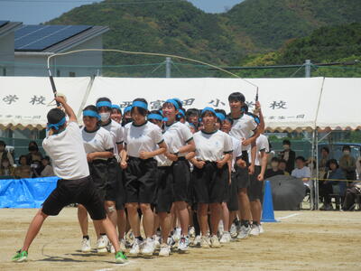 種目は、1年生は富中ハリケーン、2年生は空飛ぶじゅうたん、3年生は大縄跳びでした。